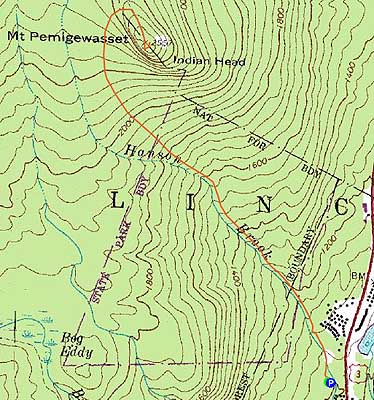Directions to trailhead: Take I-93 north from Lincoln, to exit 33. Take US 3 north. Shortly after passing the water park, the dirt road leading to the Indian Head Trail parking lot will be on the left (sign on the right for trailhead parking). The Indian Head Trail starts at the back right of the parking lot.