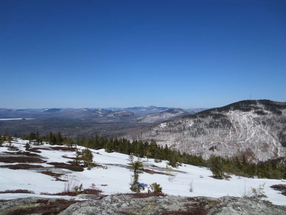 If standing at the top ramp of the triple chairlift with one's back to the ski area, head toward the light pole at about 1:00 (you'll see some towers in the distance). You'll initially start on a quasi-logging road. A few dozen feet up it, bear left onto a herd path (some blue flagging tape) and head toward the towers. This will lead to the closest tower. One can follow the access road from it initially uphill, then downhill (a bigger tower is seen in the medium distance) to another road (take a left onto it). At the end of this road, just beyond the big tower, is an excellent viewpoint ranging from the Presidentials to some of the Rangeley area peaks.