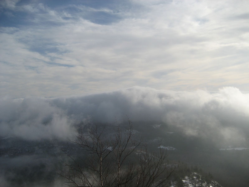 After climbing over the small subpeak and then ascending some of the steeps and ledges, I was soon at the foot of the final scramble. Since there wasn't much snow in this area, I took of my snowshoes and barebooted up to the summit. The views behind me as I did this were tremendous, as a bunch of different levels of clouds and fog made the horizon absolutely stunning - unfortunately, as I reached the summit, clouds overtook the mountain and prevented me from getting any shots other than one I took while climbing.
