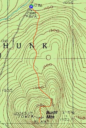 Directions to trailhead: Take the Tote Road northeast from Nesourdnahunk campground. The Burnt Mountain Picnic Area will eventually be on the right, followed immediately by the Burnt Mountain Trail trailhead.