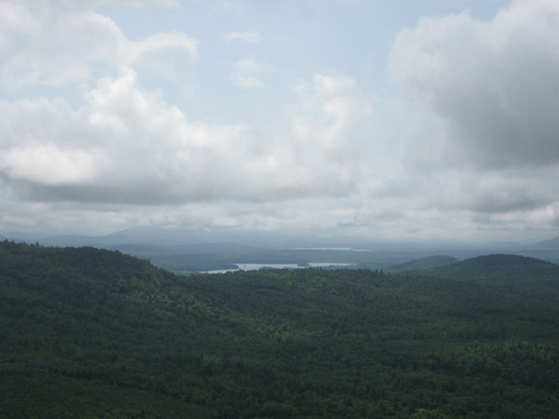Soon there after, the trail reached another view ledge, and then the true summit. While things were fairly dark outside due to the clouds, some sun broke through for a bit. The view point had decent looks at points to the east and south - though some of the higher peaks, such as Pleasant Mountain, were in the clouds. While at the viewpoint, I heard a tree fall in the woods below, answering the age old question.