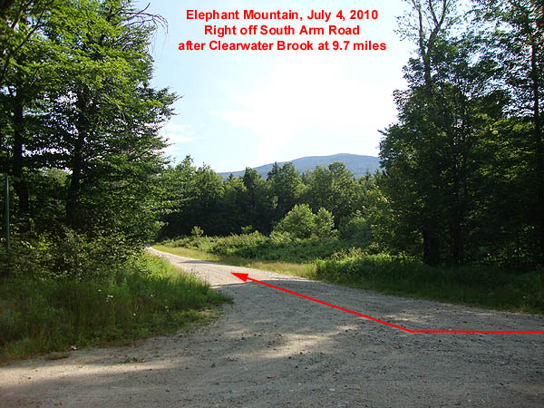 Starting at 0.0 miles on South Arm Road, the Appalachian Trail crossing will be passed between 7.4 and 7.5 miles. Just before 9.7 miles, Clearwater Brook will be crossed (sign). Just after this bridge, take a right onto an unmarked logging road (Old Country Road). If you cross Grindstone Road, you went too far on South Arm Road.