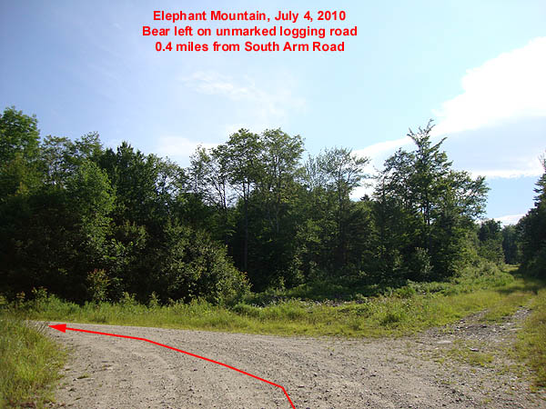 Starting at 0.0 miles, head up the logging road. Bear left at 0.4 miles onto the unmarked Elephant Mountain Road. Bear right at 1.1 miles to stay on Elephant Mountain Road. Just prior to 3 miles, the road will go downhill briefly, prior to climbing back uphill at 3.0 miles. There is limited room for parking here. The herd path starts on a grassy logging road on the left, marked with a cairn.