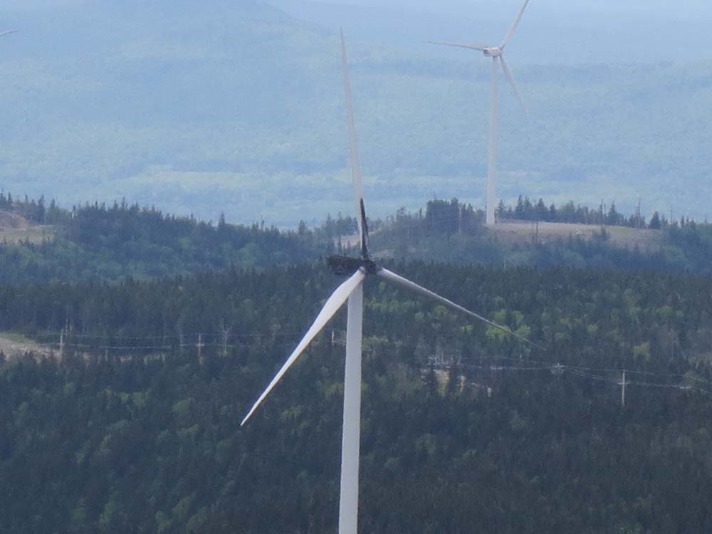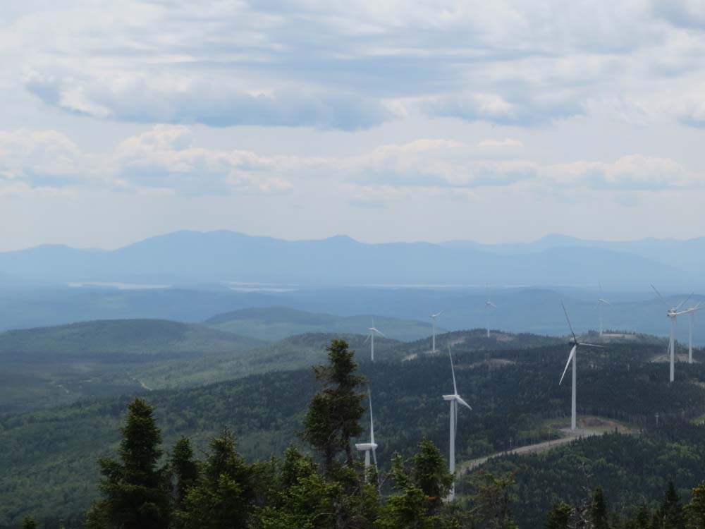Directions to trailhead: Route 27 north from Eustis to Goldbrook Road. Bear left at 3.4 miles. Bear right at 8.5 miles. Road becomes Beaudry Road at 8.6 miles. Take a right at 9 miles onto (unsigned) road, climbing steeply and soon seeing wind turbine straight ahead. At a small clearing, a lesser used road will head left. We parked here and walked that road (increasingly narrow all the way to the summit). Most vehicles should be able to make it to the clearing as of spring 2013.