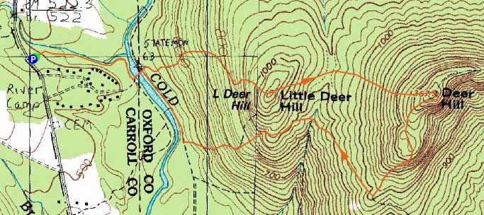 Directions to trailhead: Take Route 113 North from Fryeburg. Shortly after passing the AMC Cold River Camp entrance, the Baldface Circle WMNF fee parking area will be on the right. The Deer Hill connector trailhead is on the east side of the lot.
