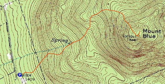 Directions to trailhead: From the Routes 142 and 156 junction in Weld, take Center Hill Road to Mt. Blue Road. The Mt. Blue Trail trailhead and parking area are located at the end of that road.