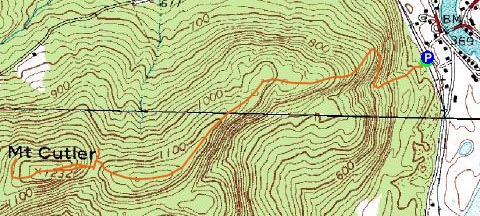 Directions to trailhead: From Route 25, take Route 5 North to Hiram. Just after 117 departs east from 5/113, cross the bridge (still on 5/113), then take an immediate left onto River Road. Very shortly after, take a right onto Mt. View Avenue. Just after Mt. View Avenue takes a sharp left turn, take a right into a small dirt parking lot next to the railroad tracks. The Mt. Cutler Trail trailhead is across the tracks, a few dozen feet to the south.