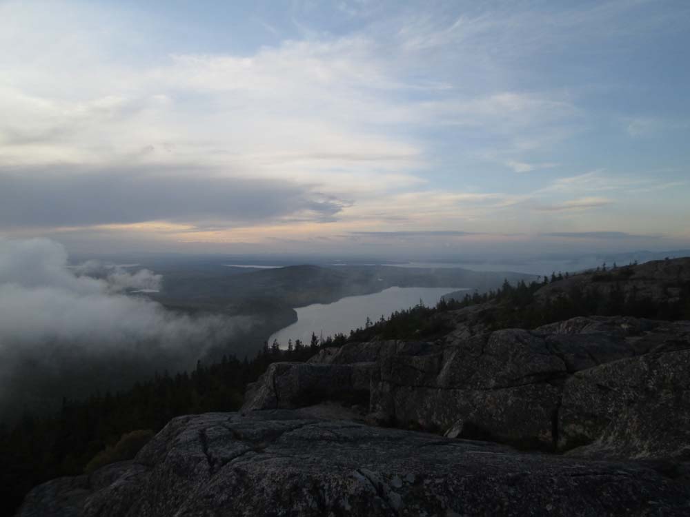 Trail was mostly dry. Not as manicured as some popular Acadia trails. Brief views from the ledgy summit as evening fog rolled in.