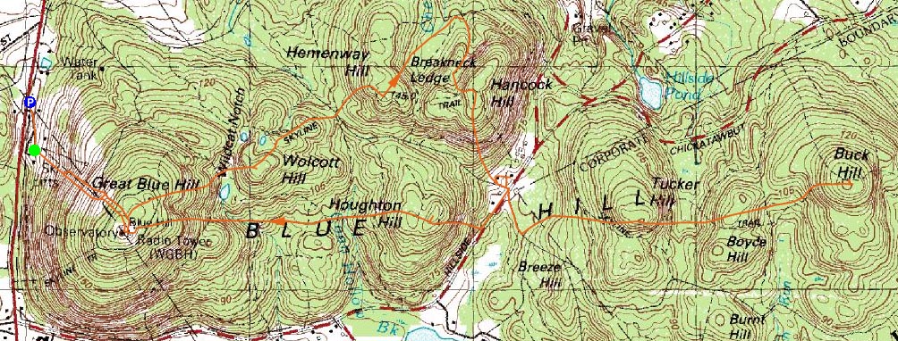 Route: Big Blue ski trail, (Great Blue Hill), bushwack, (Great Blue Hill lookout tower), Skyline Trail North, (Wolcott Hill), Skyline Trail North, unknown trail, (Hemenway Hill), Hemenway Hill Path, unknown trail, Skyline Trail North, (Hancock Hill), Skyline Trail North, Skyline Trail, (Tucker Hill), Skyline Trail, (Buck Hill), Skyline Trail, (Tucker Hill), Skyline Trail, Skyline Trail South, (Houghton Hill), Skyline Trail South, (Great Blue Hill), unknown trail, Big Blue ski trail