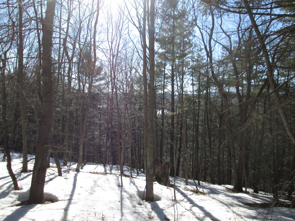 Bushwhacked from Roberts Road along the bottom of the field into the woods, then up the old Mt. Mohawk ski trails (completely overgrown). Would be unpleasant bushwhacking without snow on the ground, but spring snow conditions made it ideal. Looks like there would have been a fantastic view of Monadnock when the trails were still open, nothing to see now. Continued past the top of the lift to the highpoint, which appeared to be one of three bumps in the top contour on the map. Also evidence of some sort of 4 wheeler trail on the summit.