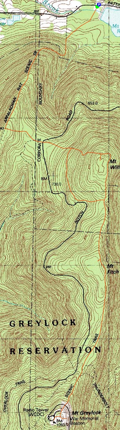 Directions to trailhead: Take Notch Road southwest from Route 2. At the fork in the road (Mt. Greylock Reservation sign), take a right and continue past the reservoir. Shortly after, there's a small sign for the Appalachian Trail and some dirt parking spots on either side of the road.