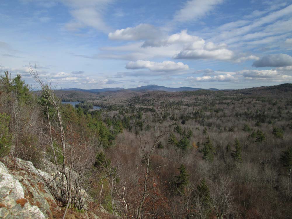 Very quick walk (two tenths of a mile one way) to a fantastic cliff vista, ranging from Cardigan to Sunapee. Easy walking on a dry old woods road.