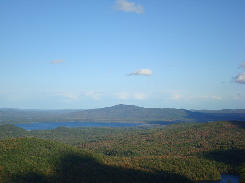 The trail up Bayle Mountain was a bit wet and slippery from the recent rain, but otherwise good. While I had been hoping for some nice foliage, the only colors were along the snowmobile trail and on some neighboring peaks. A few trees off the trail a bit were starting to turn, but for the most part the woods were still pretty green.