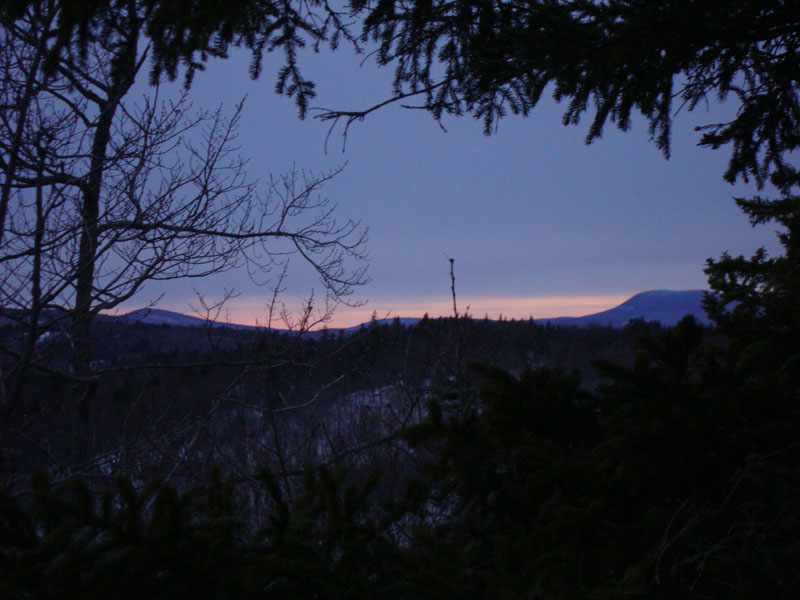Back at the summit area, I verified that a slightly off trail knob appeared to be the summit - and I found an old trail marker up on it. Seeing that it was past sunset, I bushwhacked to a quasi-west viewpoint (nice look at Cardigan), I had some slight colors to the northwest.