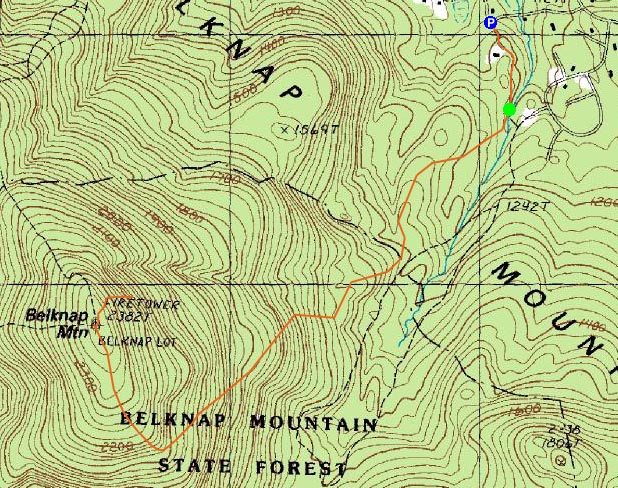 Route: East Gilford Road, (Belknap Mountain), blue blazed trail, herd path, (1972 plane crash), herd path, blue blazed trail, (Belknap Mountain), East Gilford Road