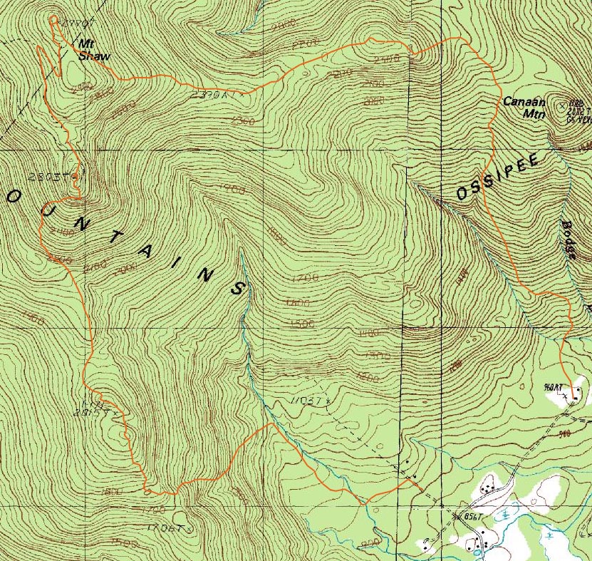Directions to trailhead: Take 171 southeast from Route 25, past Castle in the Clouds. Take a left onto Canaan Road. The Flagg Mountain Trail trailhead is located downhill, beyond the farm house at Camp Merrowvista. Permission should be attained to park there (the camp should be avoided when in session). The Camp is located at the end of Canaan Road. The Big Ball Mountain Trail trailhead is located on McDuffee Road (a left off Canaan Road before the camp). There is some room to park on the left side of McDuffee Road at the bottom of the hill, though it is recommended that hikers park at the McDuffee Road-Canaan Road intersection (please do not block any driveways or logging roads). The unmarked trailhead is also on the left (actually a seldom used dirt road), a few dozen vertical feet up McDuffee Road, across the street from a house.