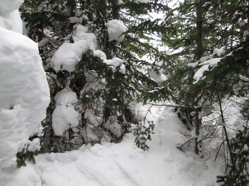 Trail was quite hard to follow in some areas due to minimal/faded/white blazes, as well as open woods and blowdowns. Also areas of extremely deep snow, in which top brushed branches are just above the snowpack.
