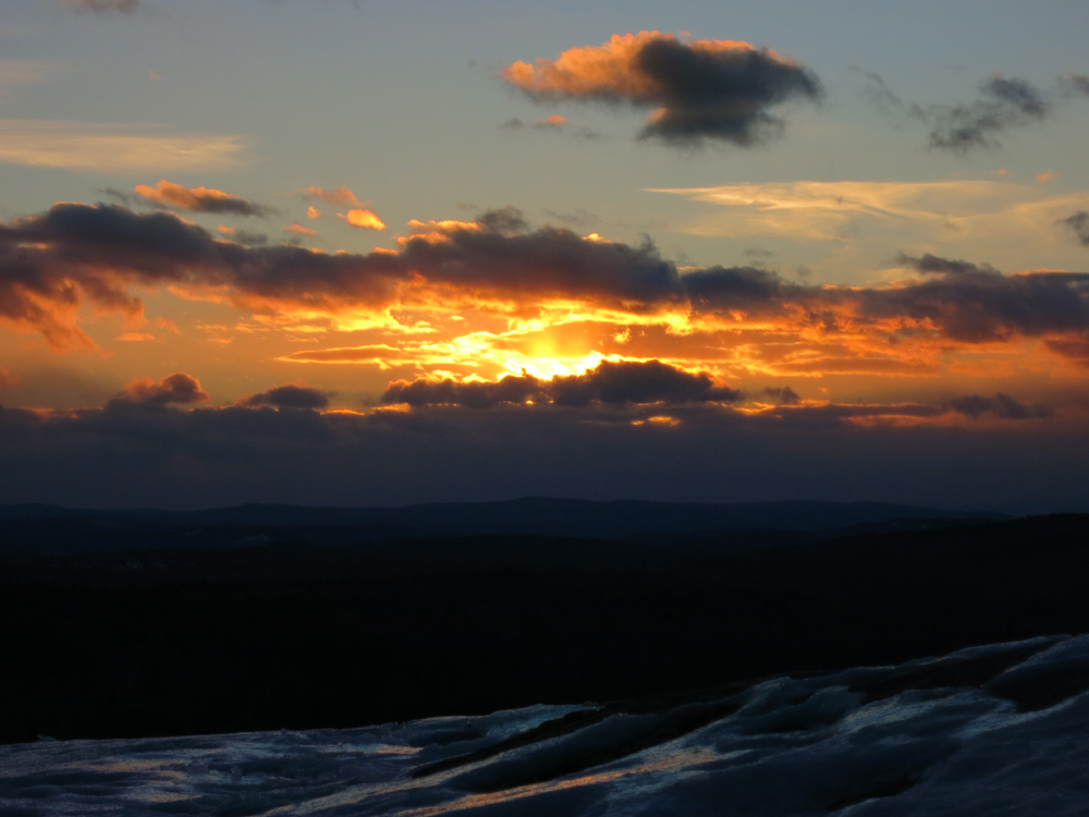 While there is generally 1-3" of snow pack in the woods, at least half the trail footbed was snow free. Otherwise, a mixture of frozen granular, blue ice, and black ice. I was able to bareboot without issue.
