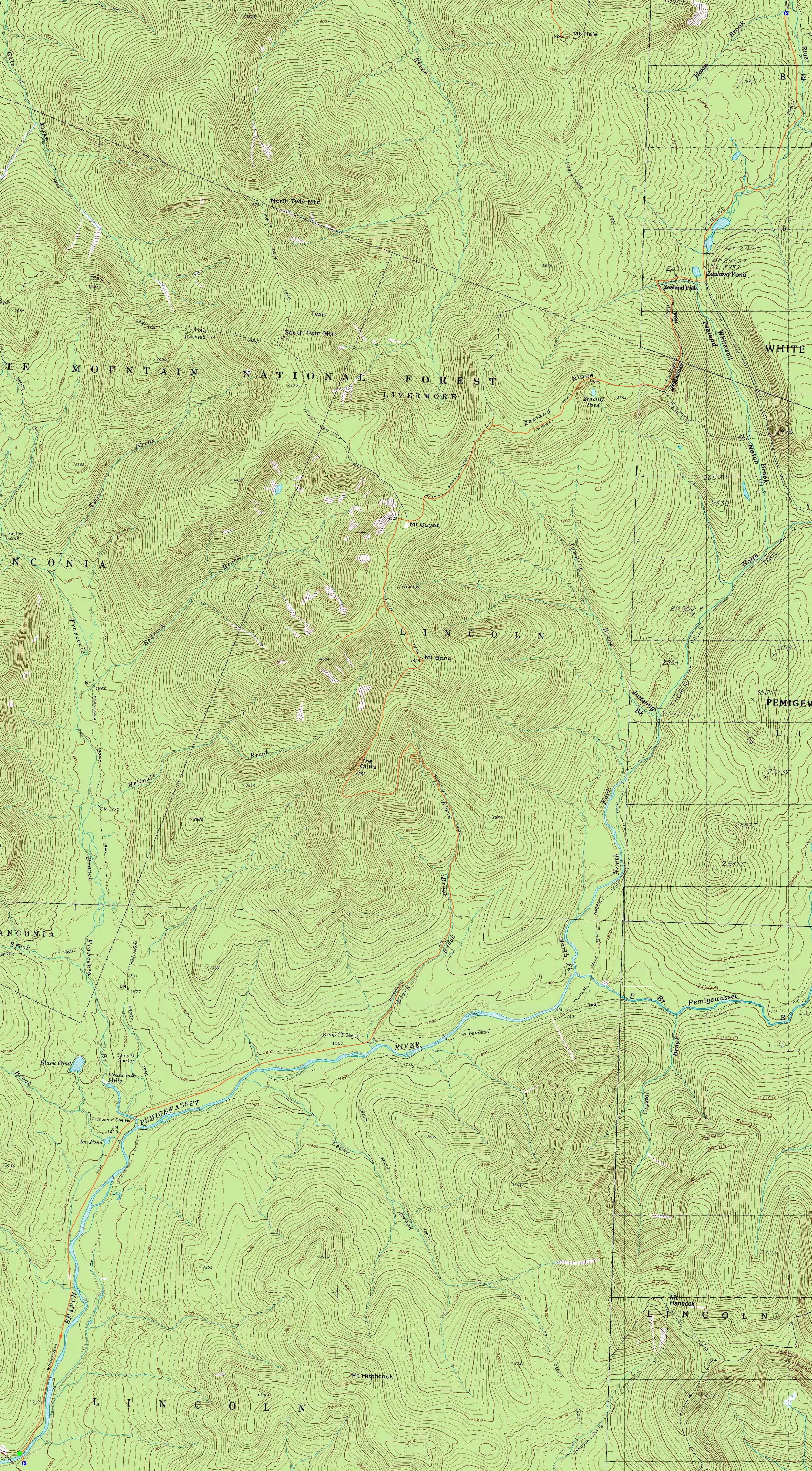 Route: Lincoln Woods Trail, Wilderness Trail, Bondcliff Trail, (Bondcliff), Bondcliff Trail, (Mt. Bond), Bondcliff Trail, West Bond Trail, (West Bond), West Bond Trail, Bondcliff Trail, Twinway, (Mt. Guyot), Twinway, spur trail, (Zealand Mountain), spur trail, Twinway, Zeacliff spur trail, (Zeacliff), Zeacliff spur trail, Twinway, Zealand Trail