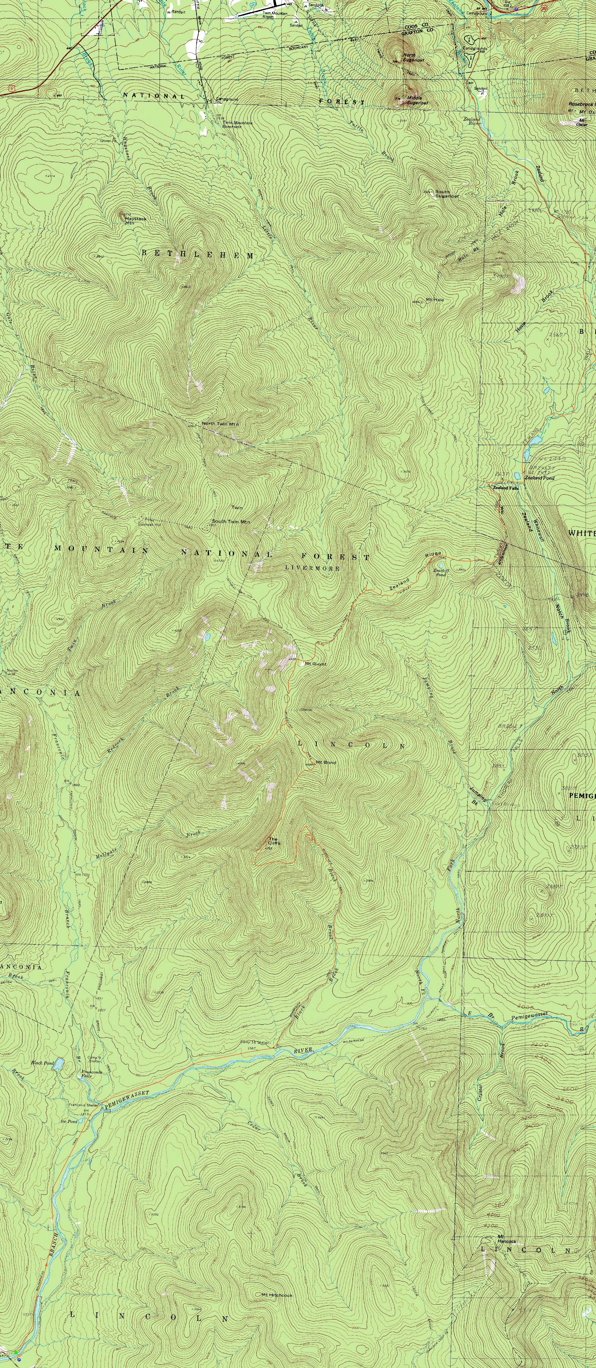 Route: Lincoln Woods Trail, Wilderness Trail, Bondcliff Trail, (Bondcliff), Bondcliff Trail, (Mt. Bond), Bondcliff Trail, West Bond Trail, (West Bond), West Bond Trail, Bondcliff Trail, Twinway, (Mt. Guyot), Twinway, spur trail, (Zealand Mountain), spur trail, Twinway, Zealand Trail, Zealand Road,