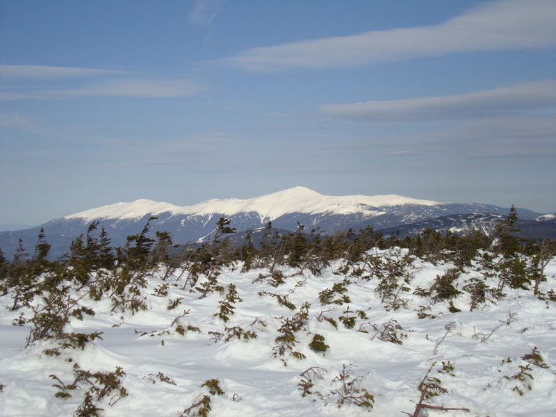It was rough going between Guyot and Zealand, as the broken out route wandered around numerous blowdowns. Nearing the height of land, we opted to walk out on the treetops, then cut 20 feet into the scrub and the summit line (literally at snowline - some 6 feet of snow). Views could be found in all directions from near the highpoint.