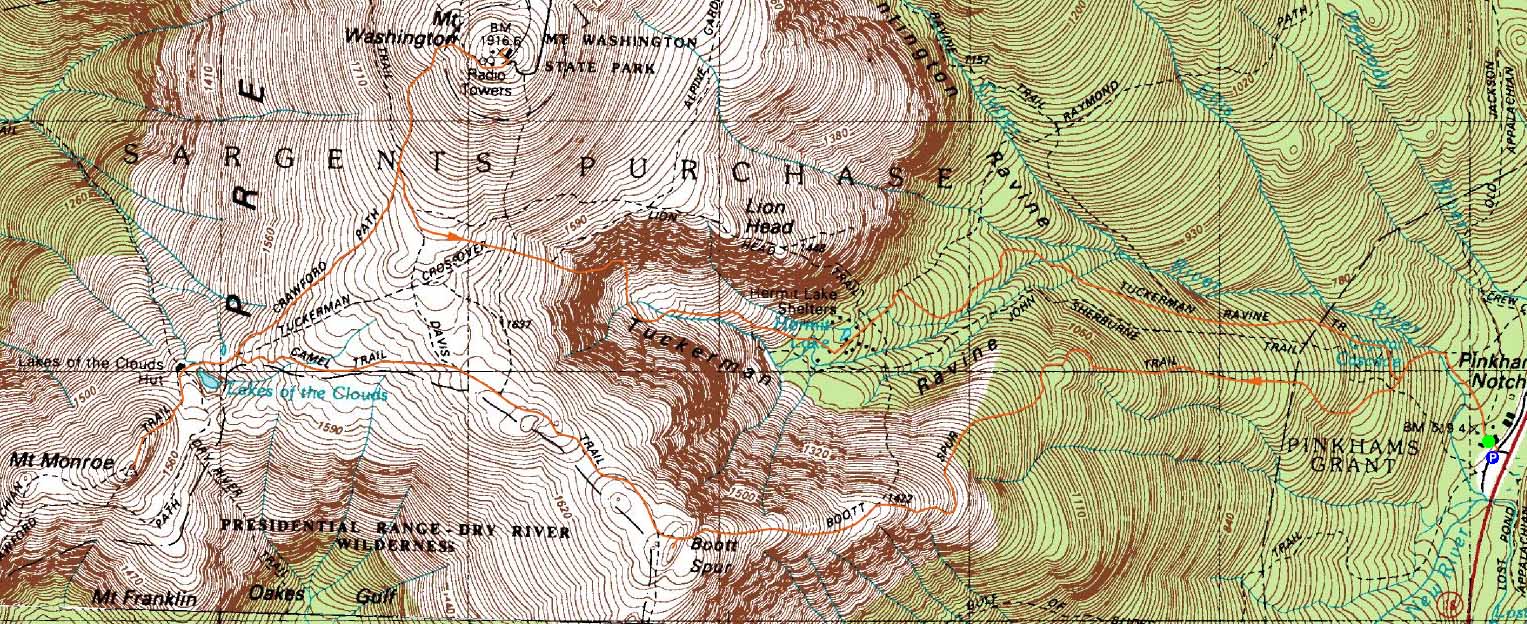 Route: Tuckerman Ravine Trail, Boott Spur Trail, rockhop, (Boott Spur), rockhop, Boott Spur Trail, Davis Path, Camel Trail, Crawford Path, Monroe Loop, (Mt. Monroe), Monroe Loop, Crawford Path, (Mt. Washington), Crawford Path, Southside Trail, Tuckerman Crossover, Tuckerman Ravine Trail