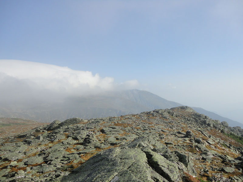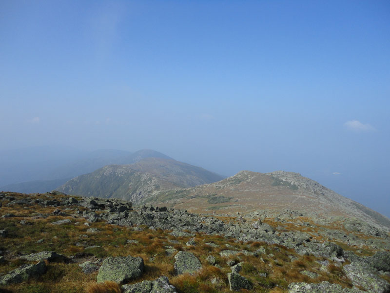 Clearing treeline, the views were hazy but nice. While the temperature was soaring, the wind picked up as I climbed. Reaching the summit of Boott Spur, there were some views, though the fog and the haze minimized them.