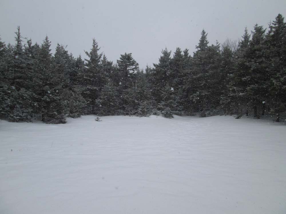 We bushwhacked up from near Reservoir Road, roughly following the forest boundary swath, though we did stray off it after awhile and found some logging roads. Eventually, we bushwhacked up to the ridge, then along it to Campton Mountain. Wooded unmarked highpoint, adjacent to a bog. Possibility for a view through the trees from a little east of there, but hard to tell. With current snowpack, the woods were reasonable.