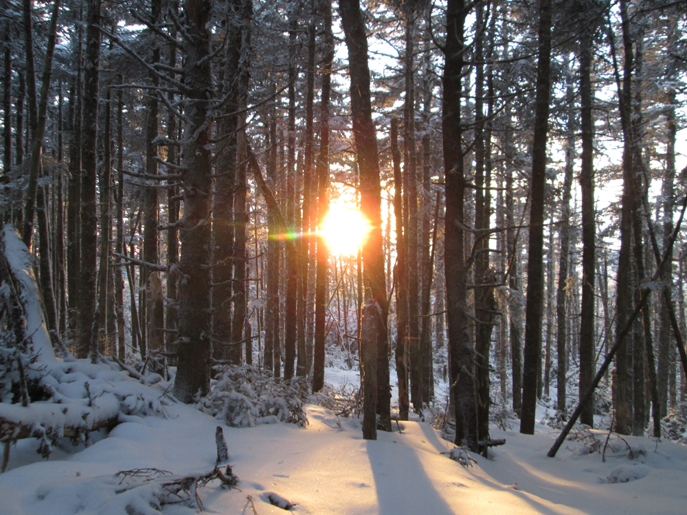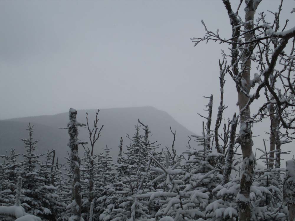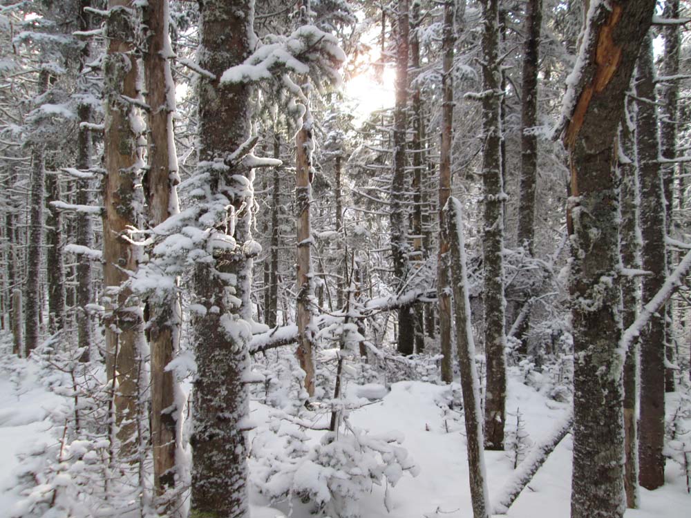 Continuing beyond the camps through a recently logged area to the gate at the snowmobile trail, we turned left and headed northeast on the snowmobile/logging road. Where the road starting to go north, we hopped into the woods with snowshoes and bushwhacked up to West Castle. So so woods as we may have been a tad bit too south (there is a very old logging road that helps ascend, but it would have been filled with snowloaded spruce). Snowpack was 6-12" of hardpack (generally no sinking with snowshoes) with half an inch to two inches of fresh powder on top.
