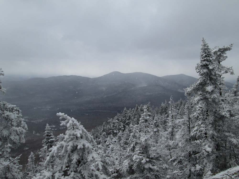 We then retraced our tracks and continued to the summit of Castle (no sign of a canister), then descended in so so woods toward Notch. Okay woods headed over Notch (no views, but I suspect one could poke around for some looks at adjacent peaks), and down to the col in so so woods. Nice open col. Above there, horribly thick spruce. In hindsight, we may have looked to descend below the col to the north, shoot across one of the old logging roads, then climb Gore from the northwest. But, from the south, the woods we had were thick spruce with some blowdown. Slow going.