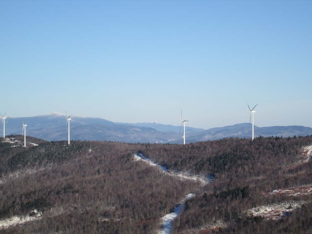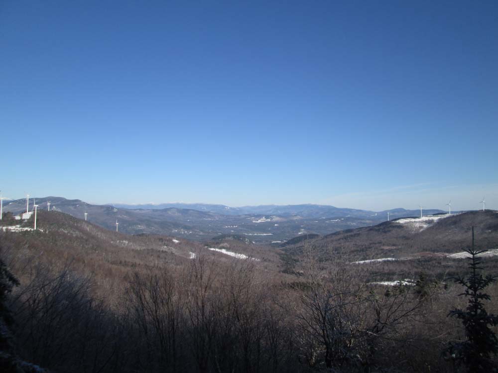 We eventually popped out at the clearcut, which is bisected horizontally by a logging road that leads to the windfarm. We crossed over it and continued to the highest point of the clearcut (good views of Kearsarge/Cardigan and no views of the turbines), then bushwhacked through fairly open woods to the highpoint of Fletcher (no sign/register, but an old piece of string on a tree). There was an unexpected nice directional viewpoint a few feet from the highpoint, which provided a look through the eyesore windfarm at the Whites (including Mt. Washington).