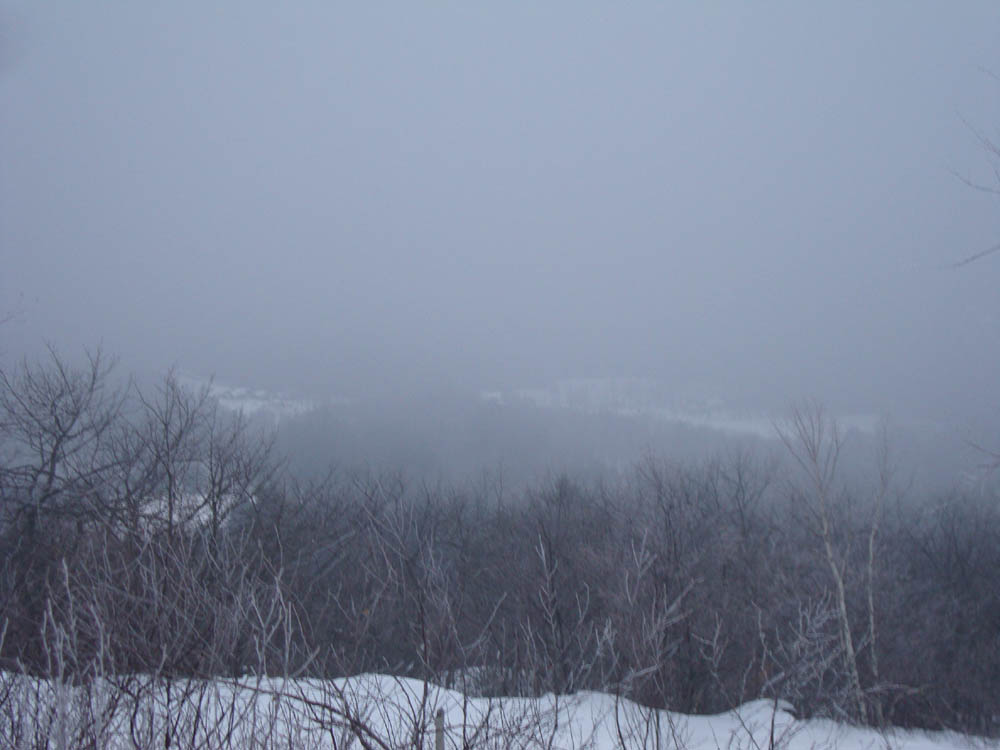 While the road started off gradually, it did steepen up a little bit as it switchbacked up to the top of Fort Mountain. Though it appeared there could be very nice views from adjacent the summit communications tower, snow flurries and mist obscured most of what might otherwise be seen.