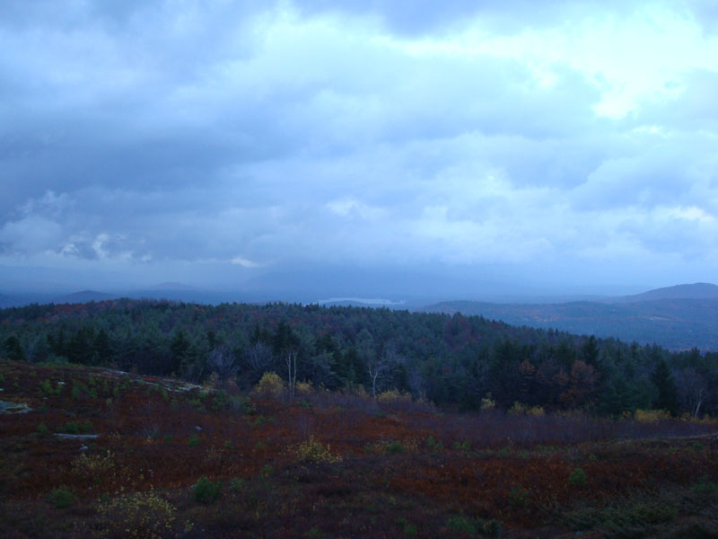 While the Foss Mountain Trail was a bit wet, it wasn't too bad. Arriving at the summit of the north peak, I was bombarded by wind. While I could see some very brief glimpses of blue sky, by and large the views were dominated by dark clouds. Nonetheless, the scenery was good - the Ossipees, Conway Lake, Ossipee Lake, and Green Mountain were all visible. Based upon the dark clouds and what sounded like thunder, I decided not to wait around for a potential sunset.