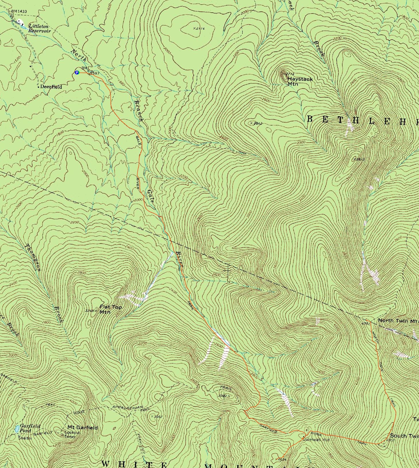 Route: Gale River Trail, Garfield Ridge Trail, Frost Trail, (Galehead Mountain), Frost Trail, (Galehead Hut), Frost Trail, Twinway, (South Twin Mountain), North Twin Spur, (North Twin Mountain), North Twin Spur, (South Twin Mountain), Twinway, Frost Trail, (Galehead Hut), Frost Trail, Garfield Ridge Trail, Gale River Trail