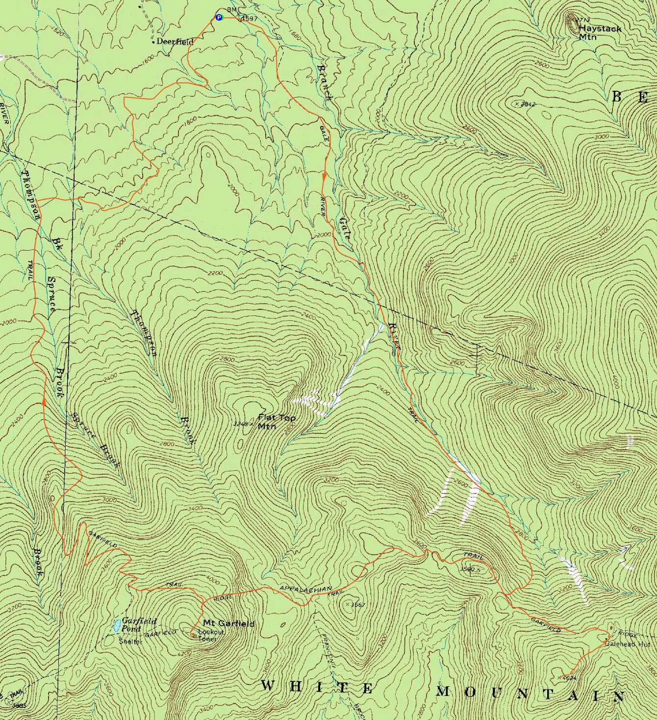 Route: Gale River Trail, Garfield Ridge Trail, Frost Trail, (Galehead Mountain), Frost Trail, (Galehead Hut), Frost Trail, Garfield Ridge Trail, (Mt. Garfield), Garfield Ridge Trail, Garfield Trail, unknown road, Gale River Road