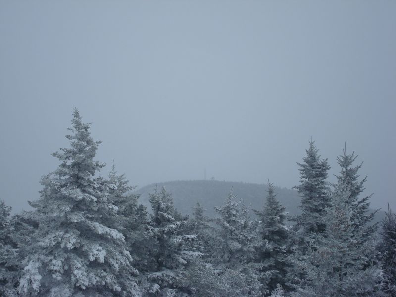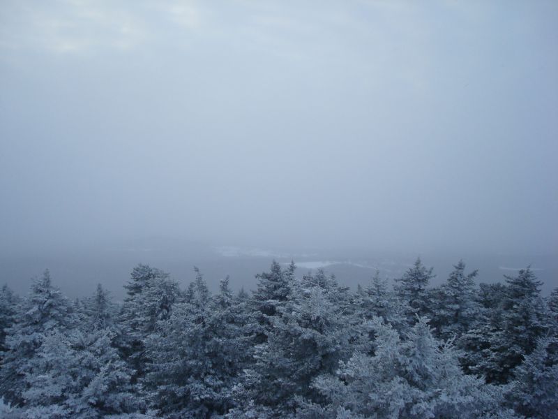 The Gunstock Mountain Trail had been broken out earlier in the day, so the snowshoeing wasn't overly challenging. The upper portion of the trail was quite neat, as there was a bit of rime on the trees. While we saw no one on the trail, the summit area was busy with skiers. Due to the continued light snow, the views were very limited - the only thing visible was Belknap Mountain.