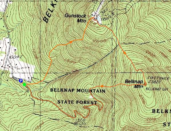 Route: Carriage Road, Gunstock Mountain Trail, (Gunstock Mountain), Saddle Trail, Blue Trail, (Belknap Mountain), Green Trail, Carriage Road