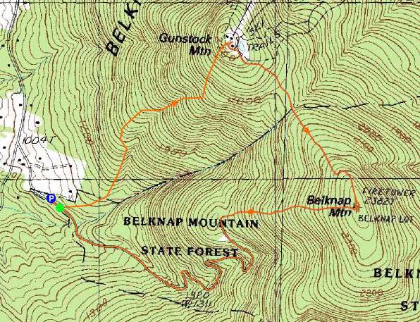 Route: Carriage Road, Gunstock Mountain Trail, (Gunstock Mountain), Saddle Trail, Blue Trail, (Belknap Mountain), Green Trail, Carriage Road