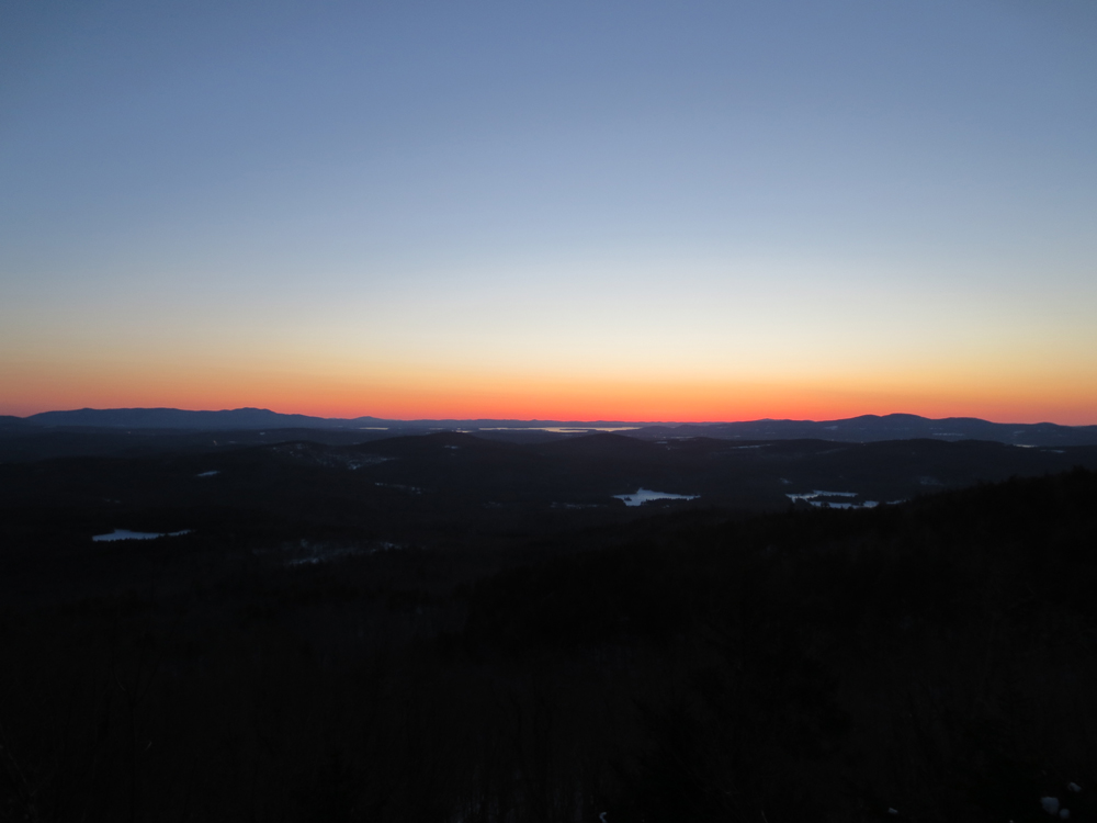 Directions to trailhead: From I-93 in New Hampton, take Route 104 West. Take a left onto Route 132. Shortly thereafter, take a right onto Old Bristol Road. Awhile down this road, take a left onto Carter Mountain Road. There will eventually be a Class IV road sign, with adjacent gate. In winter, there is limited plowed parking to the right of this gate. One can continue down the road on foot, passing straight through snowmobile junction D. Shortly thereafter, there is a logging landing on the right (at the border of George Duncan State Forest). A quasi trail heads uphill on an increasingly faint logging road from this landing (ignore a chained road on the left at the lower landing).