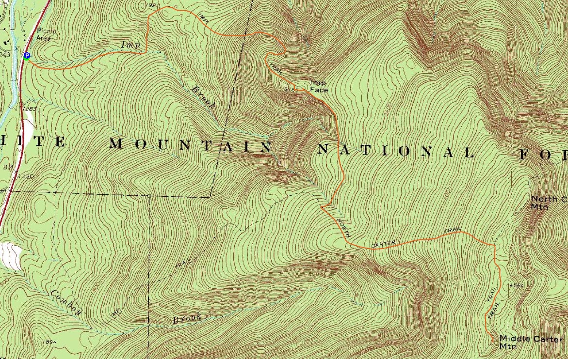 Route: Imp Trail, (Imp Face), Imp Trail, North Carter Trail, Carter-Moriah Trail, (Middle Carter Mountain), Carter-Moriah Trail, North Carter Trail, Imp Trail, (Imp Face), Imp Trail