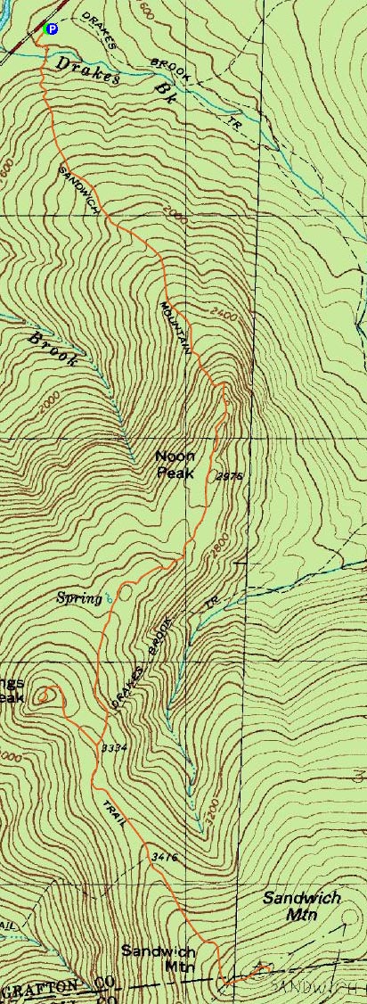 Directions to trailhead: Take Route 49 toward Waterville Valley. Take a right less than a mile before (south of) Tripoli Road. The small WMNF fee parking lot is straight ahead. The Sandwich Mountain Trail trailhead is located just before the parking lot on the right.
