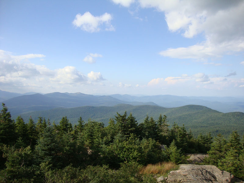 After checking out the views for awhile, we headed south-southwest from the summit. Exploring countless open view ledges, it was fairly easy going for quite some time (though there was a deep gully to get around at one point). However, after dropping perhaps 250-300 vertical feet, we hit cliff areas surrounded by blowdown-filled woods. To get around this, we eventually reclimbed a bit, then pushed back over to the trail near the middle ledge portion.