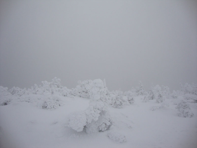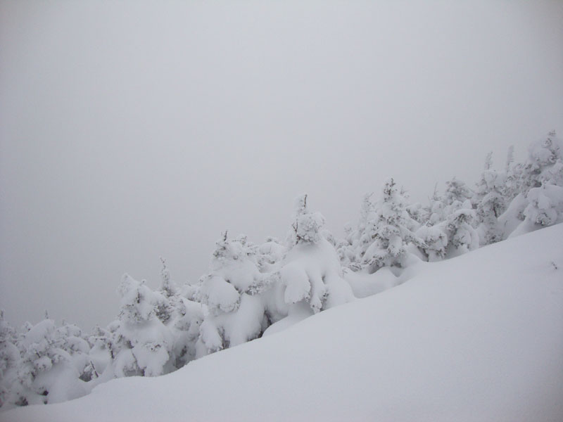 The ridge had already been broken out, making for pretty smooth sailing. The scramble ledges on either end of North Kinsman were filled in nicely. Unfortunately, there were no views from either peak due to clouds.