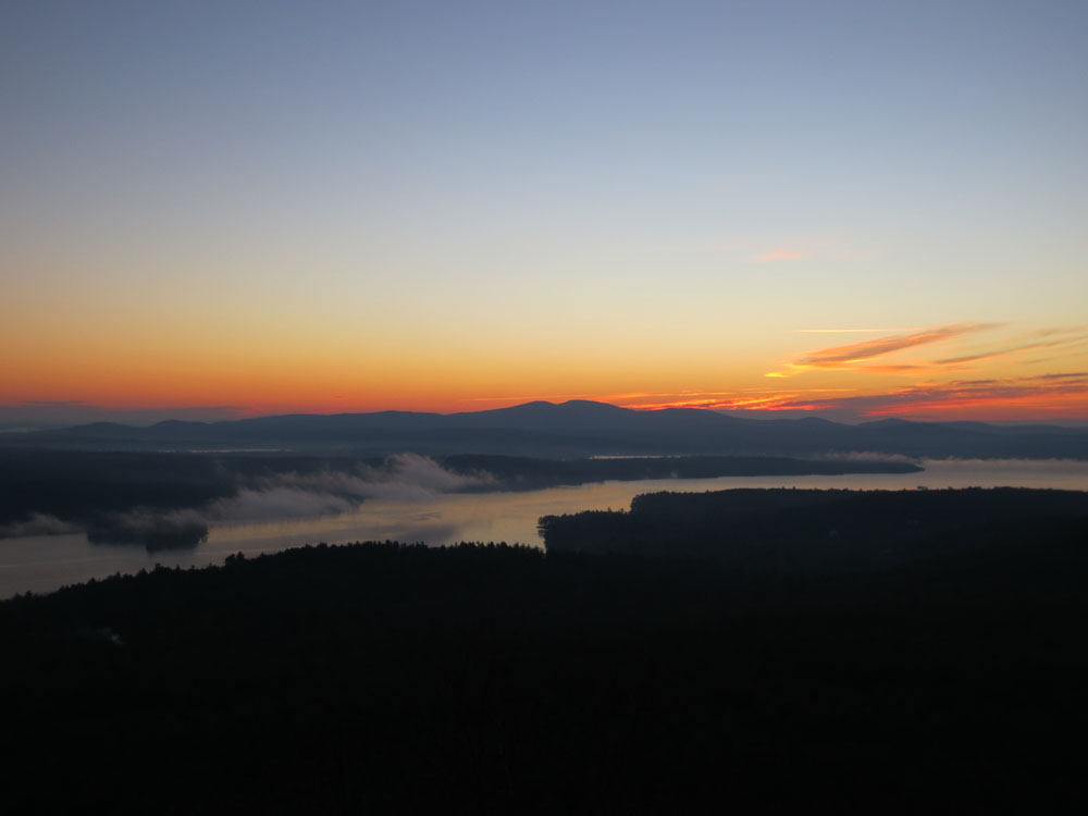 Ten days after jogging to Ladd Mountain for a no-show sunrise, I tried again and was successful. Distant clouds obscured the actual rise, however there was still plenty of color along the horizon, as well as some nice fog moving along Lake Winnisquam.