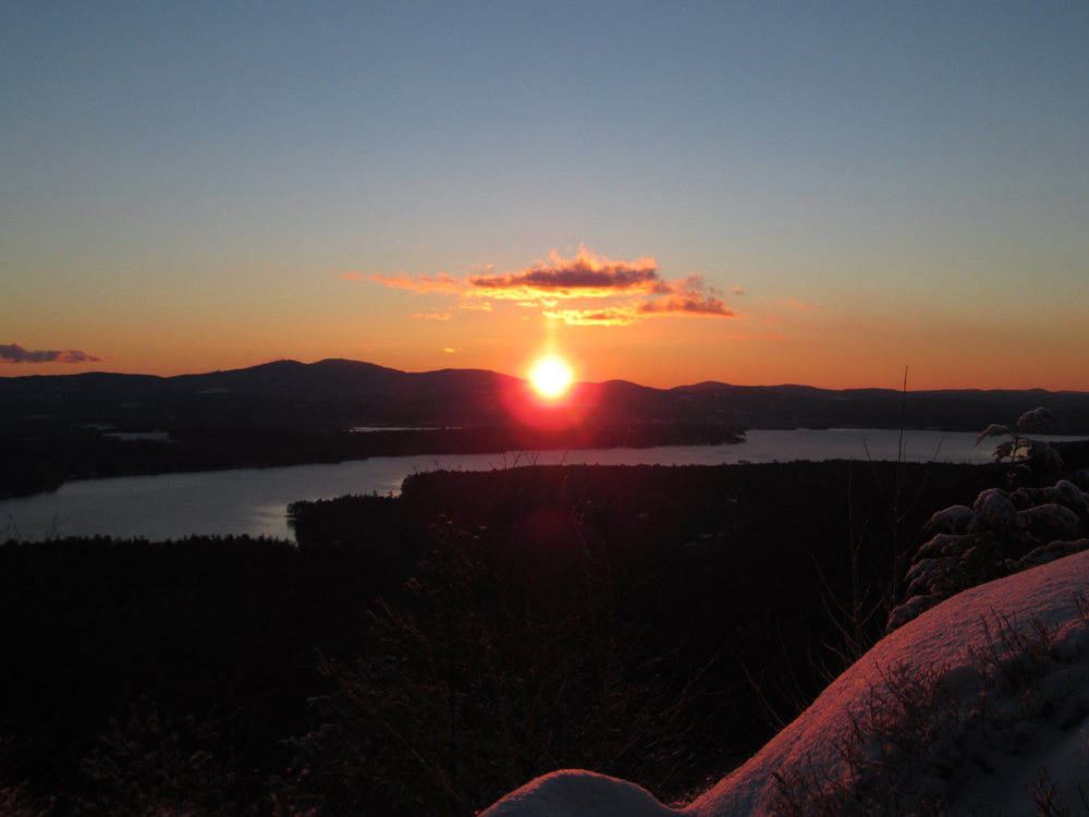 The sunrise over Lake Winnisquam from the Ladd Mountain ledge vista