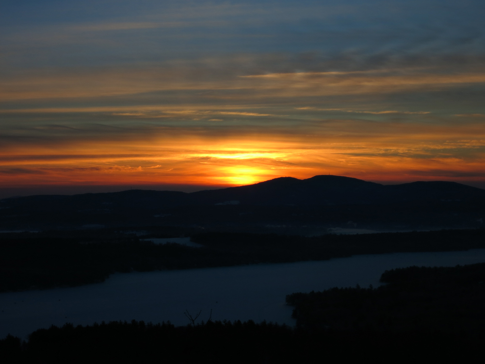 The sunrise over Lake Winnisquam from the Ladd Mountain ledge vista