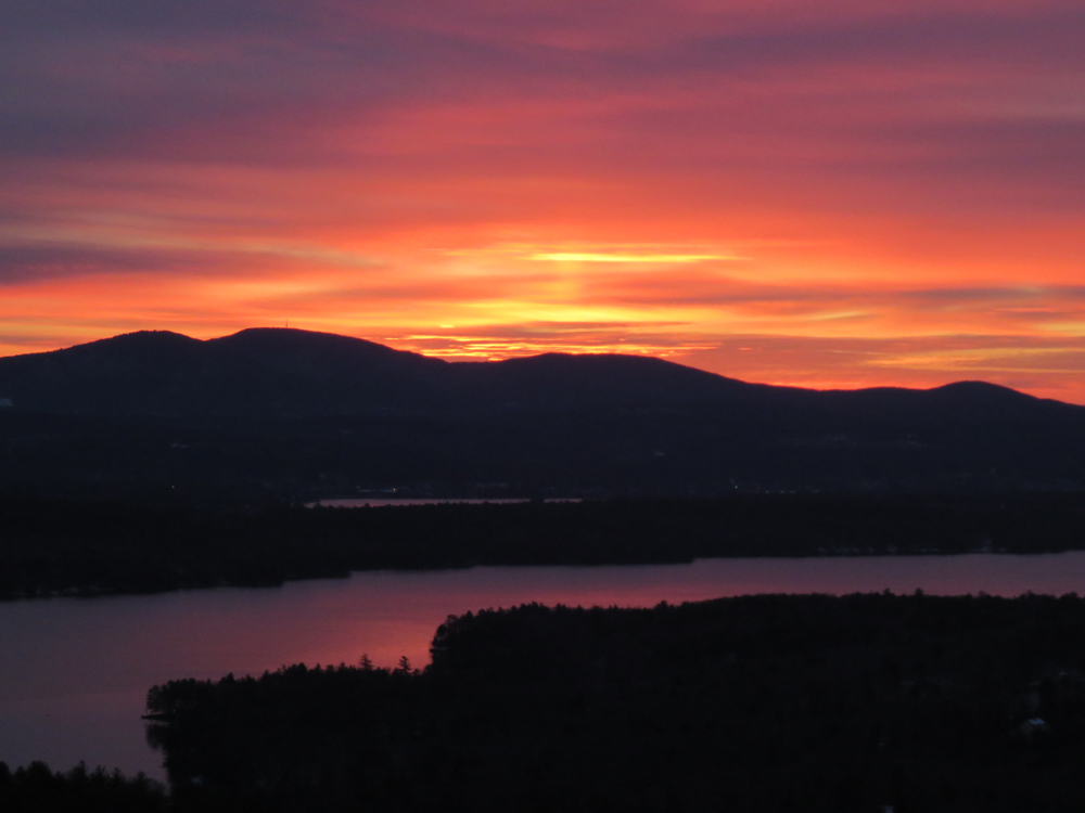 The sunrise over Lake Winnisquam from the Ladd Mountain ledge vista