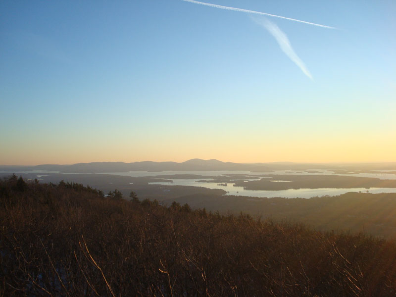 After watching the horizon for about ten minutes after the actual sunset, I started my descent. Thanks in part to the continued colors coming from the horizon, as well as the patches of snow, I was able to get a decent amount of hiking in without needing to rely upon my headlamp. The Banana and Tate Mountain Trails were also quite scenic for the descent, as there were multiple nice views of the colorful horizon. For that reason, and for the summit views, I think Big Ball Mountain is one of the best Lakes Region sunset hikes.