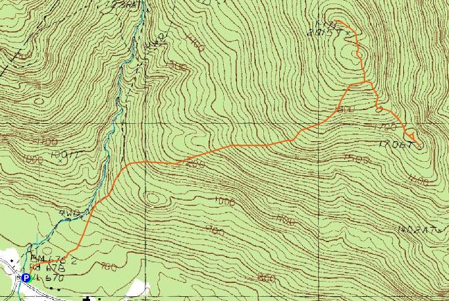 Directions to trailhead: Take 171 southeast from Route 25, past Castle in the Clouds. Shortly after crossing the Tuftonboro town line, there is a bridge/brook crossing. Immediately after this, there is an informal parking lot on the left (maybe 4 cars). The unmarked trail starts at the back of this lot.
