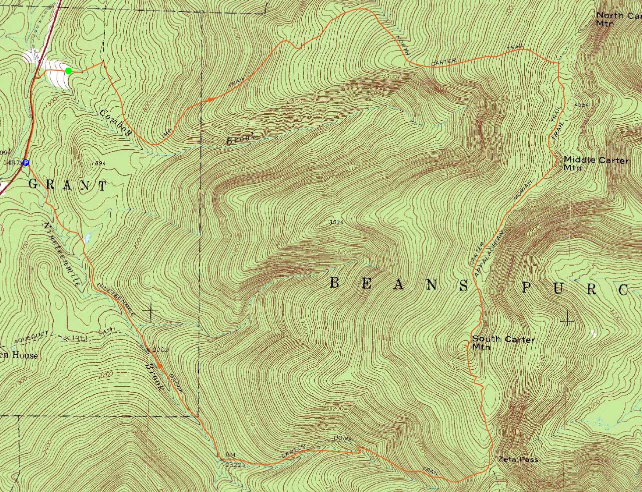 Route: Route 16, Camp Dodge road, unknown trail, Imp Trail, North Carter Trail, Carter-Moriah Trail, (Middle Carter Mountain), Carter-Moriah Trail, (South Carter Mountain), Carter-Moriah Trail, Carter Dome Trail, Nineteen Mile Brook Trail